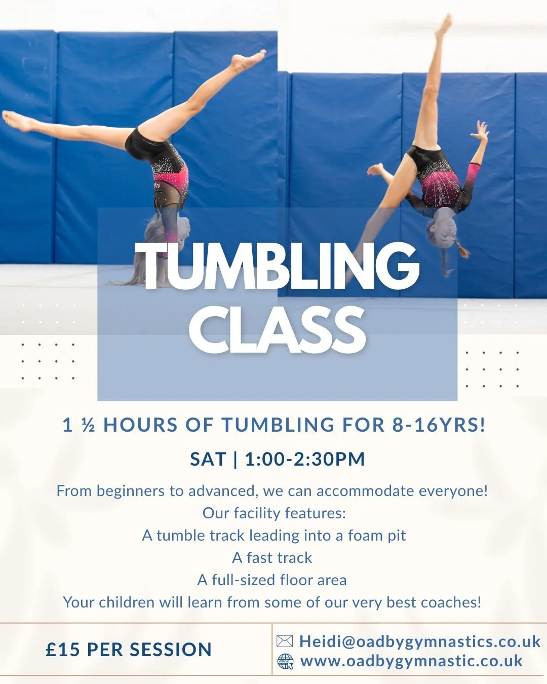 We are excited to announce the launch of our new Saturday Tumbling Class, designed specifically to develop strength, technique, and confidence in tumbling skills.